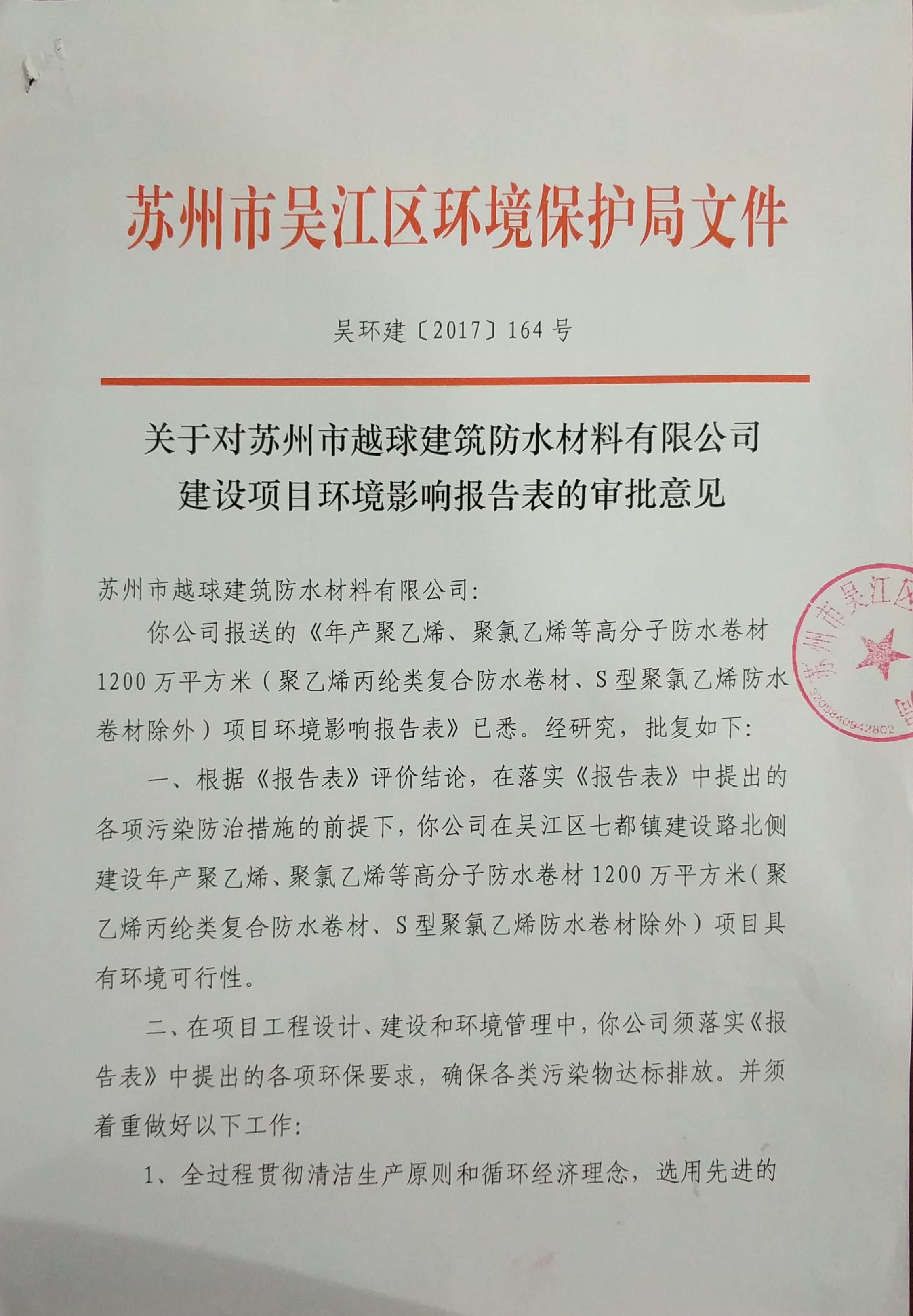 關(guān)于對蘇州市越球建筑防水材料有限公司建設(shè)項目環(huán)境影響報告表的審批意見